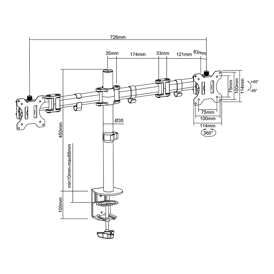 Až 360° rotace, 180° natočení a ±45° sklopný úhel umožní nastavit monitory do požadované pozice (zobrazení landscape i portrét)